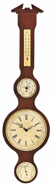 Barometr z masivního dřeva s teploměrem, vlhkoměrema hodinami. Luxusní interiérový doplněk. Rám barometru je tvořen z kvalitního masivního dřeva. Velmi dobře se hodí k interiéru každého domova.
