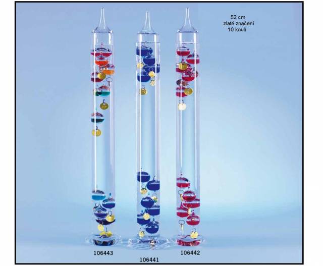 Zhotoven podle návodu Galileo Galilea (1564 - 1642). Galileo Galilei objevil při výzkumu měření teploty metodu měření teploty založenou na změně hustoty vody v závislosti na teplotě. Tím se mění podmínky plavání dutých baněk v kapalině. Do válce naplněného tekutinou vložil několik přesně zvážených kuliček, které pak podle teploty v tekutině klesaly nebo stoupaly. Tím zjistil údaj o teplotě. Pevné těleso je při stejné velikosti a hmotnosti vystaveno v tekutině tlaku k ponořování - při stoupání teploty, ke stoupání - při klesající teplotě. Rozdíl hmotnosti skleněných kuliček za současného působení hustoty tekutiny zaručuje, že vždy správná teplota je udávána nejspodnější z kuliček, které v tekutině plavou. Teplota se dá odečíst z plomby spojené s kuličkou.
