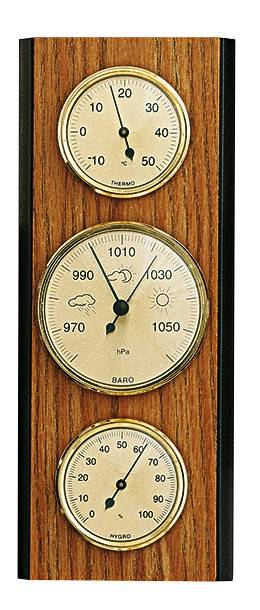 Barometr z masivního dřeva s teploměrem a vlhkoměrem. Luxusní interiérový doplněk. Rám barometru je tvořen z kvalitního masivního dřeva. Velmi dobře se hodí k interiéru každého domova. Barva dub rustikální.