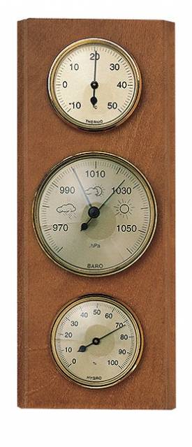 Barometr z masivního dřeva s teploměrem a vlhkoměrem. Luxusní interiérový doplněk. Rám barometru je tvořen z kvalitního masivního dřeva. Velmi dobře se hodí k interiéru každého domova.