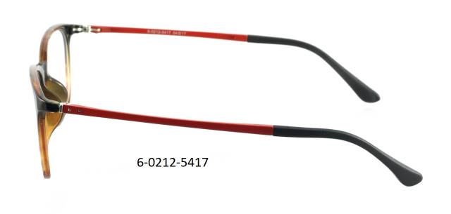 Plastová brýle celoobruba. Barva očnice červenohnědý mramor krystal, stranice červené mat s dekorem, plastové. Materiál UL.