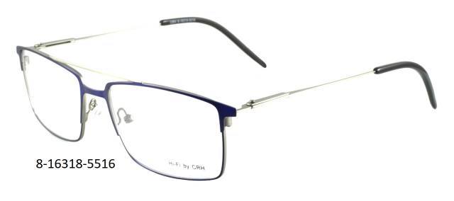 Kovová brýle celoobruba: dvojitá hrazda, barva očnice modrá mat, stranice kovové gun mat, flexové. Materiál AP ST.