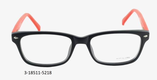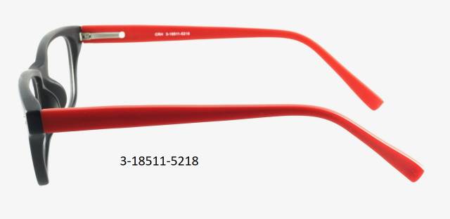 Plastová brýle celoobruba: barva očnice černá mat s dekorem, stranice plastové, červené mat, flexové. Materiál IJ.