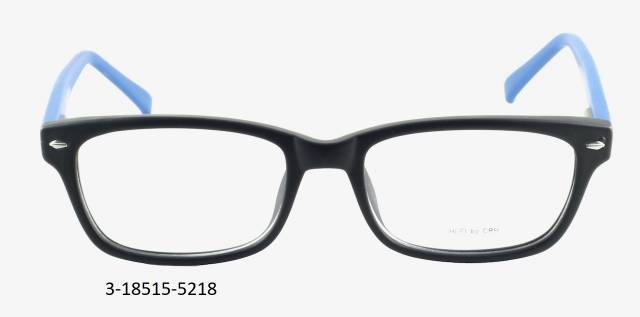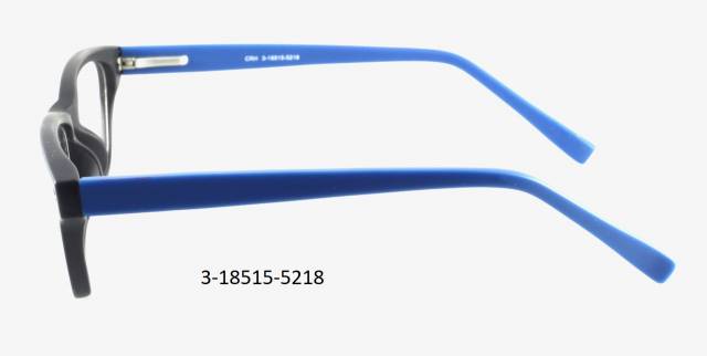 Plastová brýle celoobruba: barva očnice černá mat s dekorem, stranice plastové, modré mat, flexové. Materiál IJ.