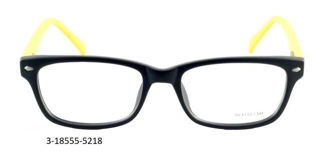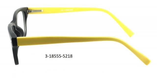 Plastová brýle celoobruba: barva očnice černá mat s dekorem, stranice plastové, žluté mat, flexové. Materiál IJ.